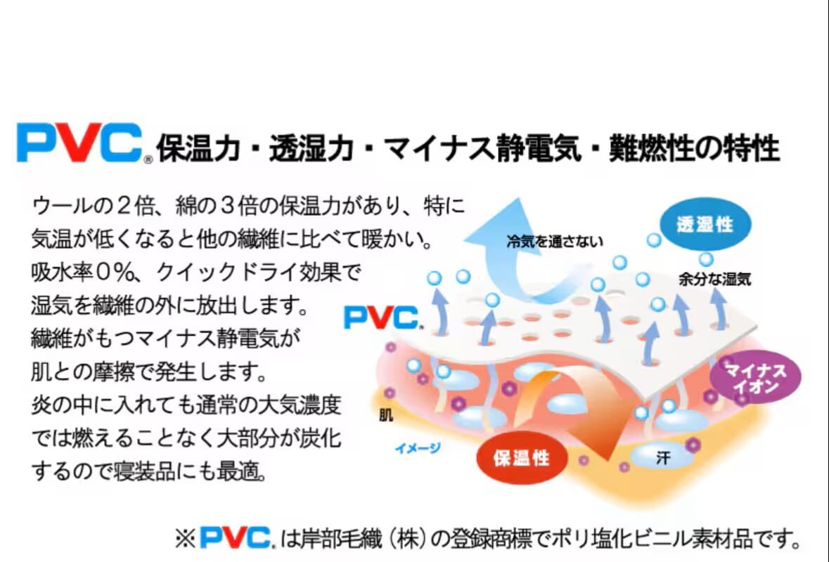 PVCは、岸部毛織(株)の登録商法でポリ塩化ビニル素材品です。