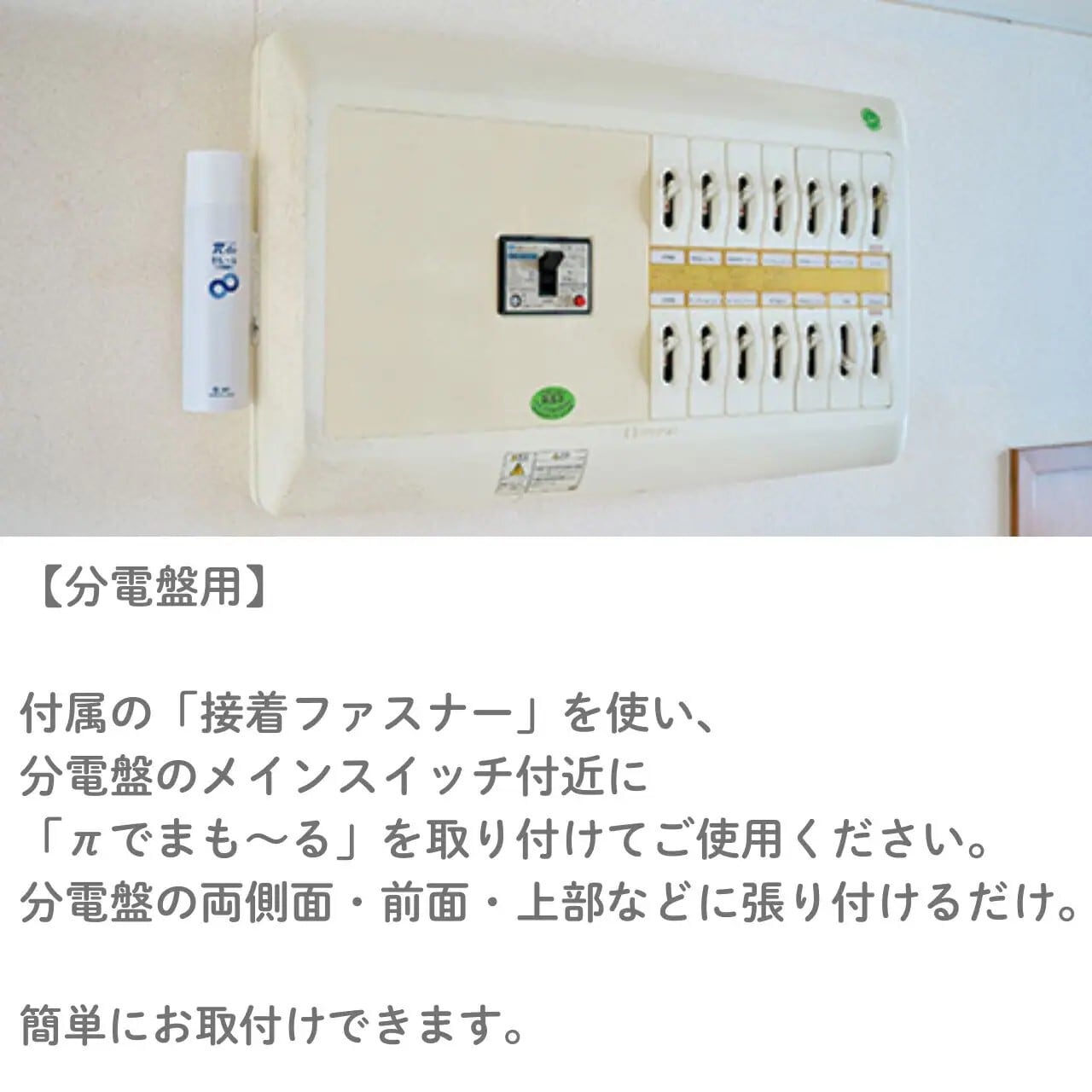 付属の「接着ファスナー」を使い、分電盤のメインスイッチ付近に「πでまも〜る」を取り付けてご使用ください。分電盤の両側面・前面・上部などに張り付けるだけ。簡単にお取付けできます。