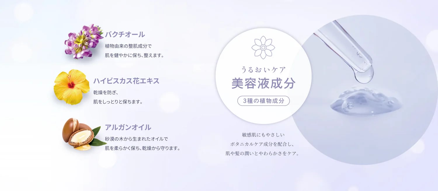 炭酸Na、硫酸Na、炭酸水素Na、バクチオール、ハイビスカス花エキス、アルガニアスピノサ核油、BG、水