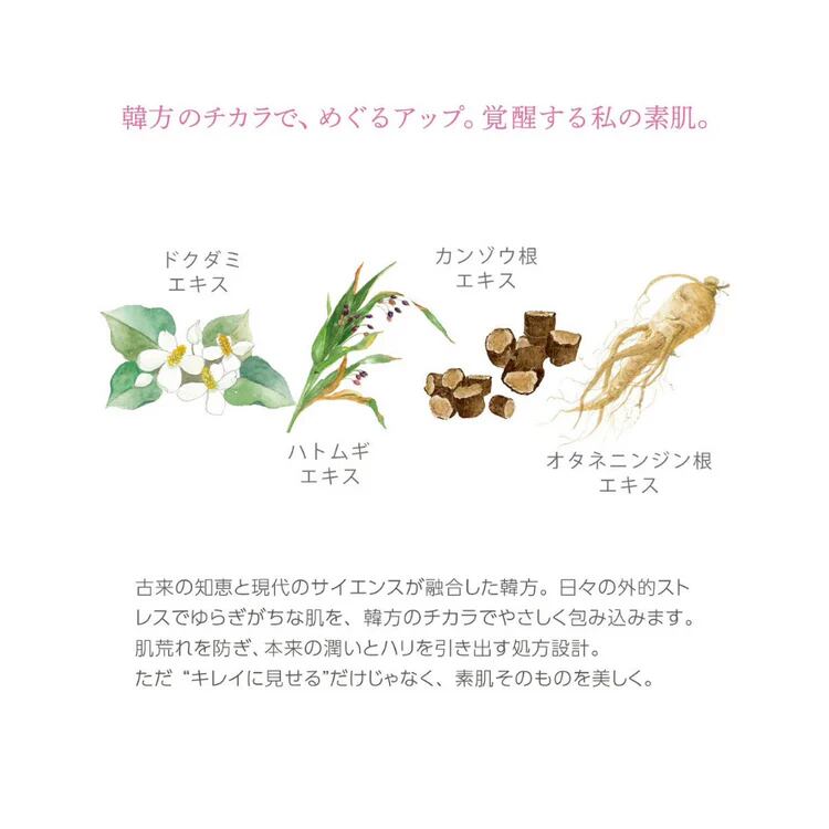 LGP、水、エタノール、グリチルリチン酸2K、ヒドロキシエチルセルロース、ポリソルベート80、フェノキシエタノール、パンテノール、メントール、ポリメタクリル酸メチル、オタネニンジン根エキス、ショウガ根茎エキス、二酸化炭素、BG、キハダ樹皮エキス、センキュウ根茎エキス、ウンシュウミカン果皮エキス、トウキ根エキス、ハトムギ種子エキス、ドクダミエキス